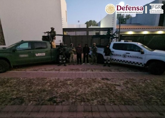 También se informa que fueron detenidos dos de sus colaboradores y se aseguraron dos inmuebles, utilizados como puntos de operación y resguardo de armamento, vehículos, municiones y droga.