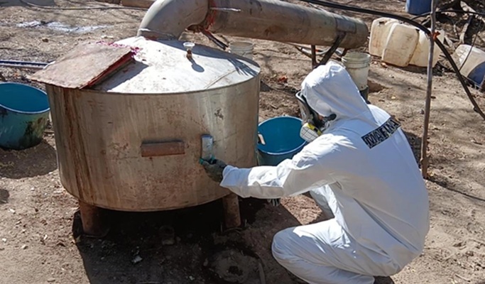 El segundo operativo tuvo lugar en el poblado de Los Cedros, Sinaloa, donde las autoridades desmantelaron otro laboratorio y aseguraron aproximadamente 750 kilos de producto terminado, además de 1,150 litros y 695 kilos de sustancias químicas.
