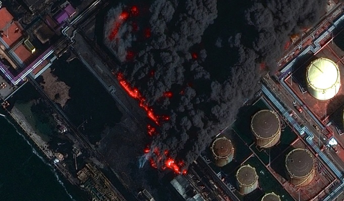 Las imágenes de satélite también mostraron que ocho depósitos de productos petroleros con una capacidad de 30,000 metros cúbicos cada uno en una terminal, llamada Ust-Luga Oil, resultaron dañados por el fuego. Esto representa aproximadamente una cuarta parte de todo el almacenamiento de la terminal.